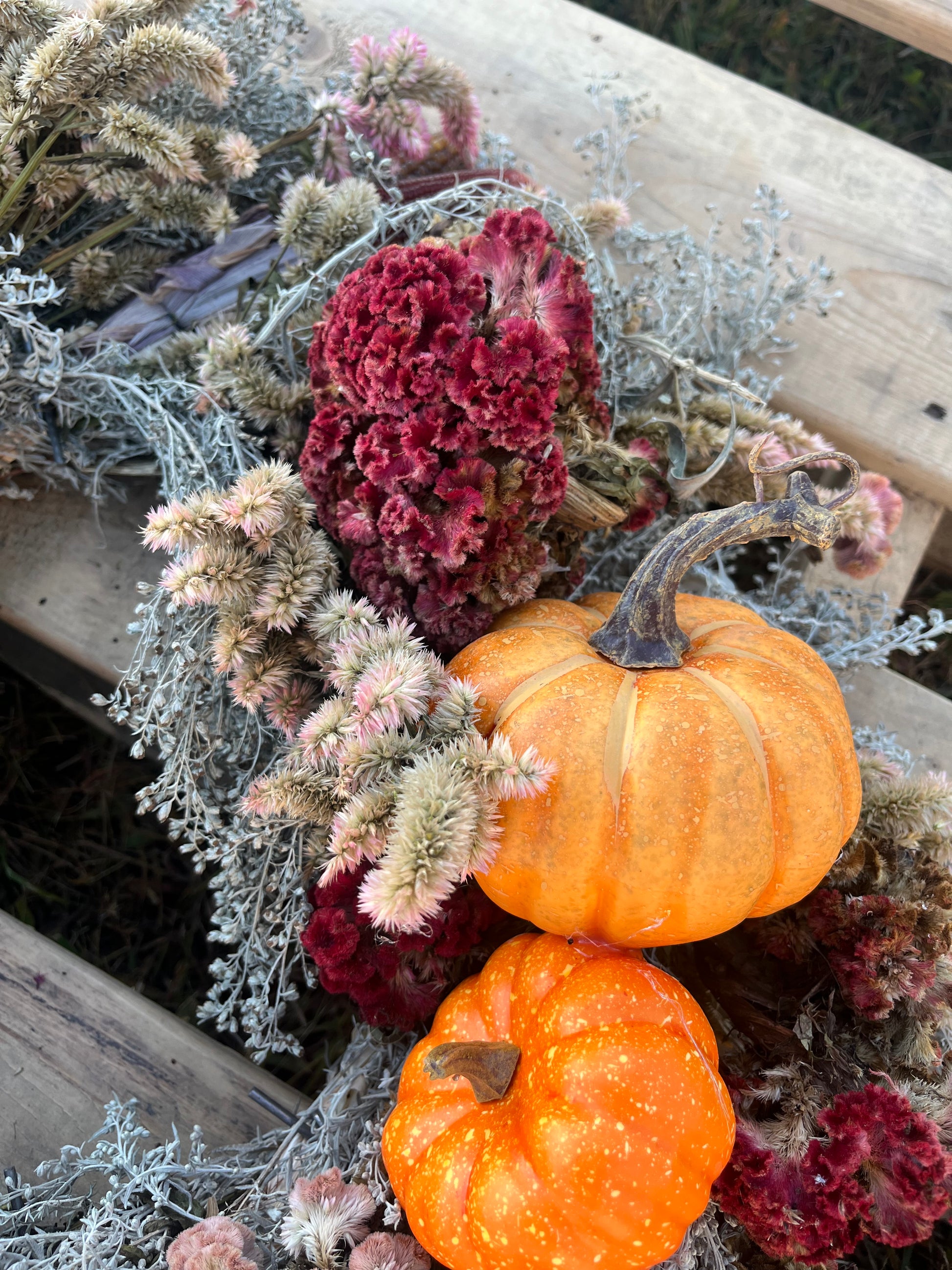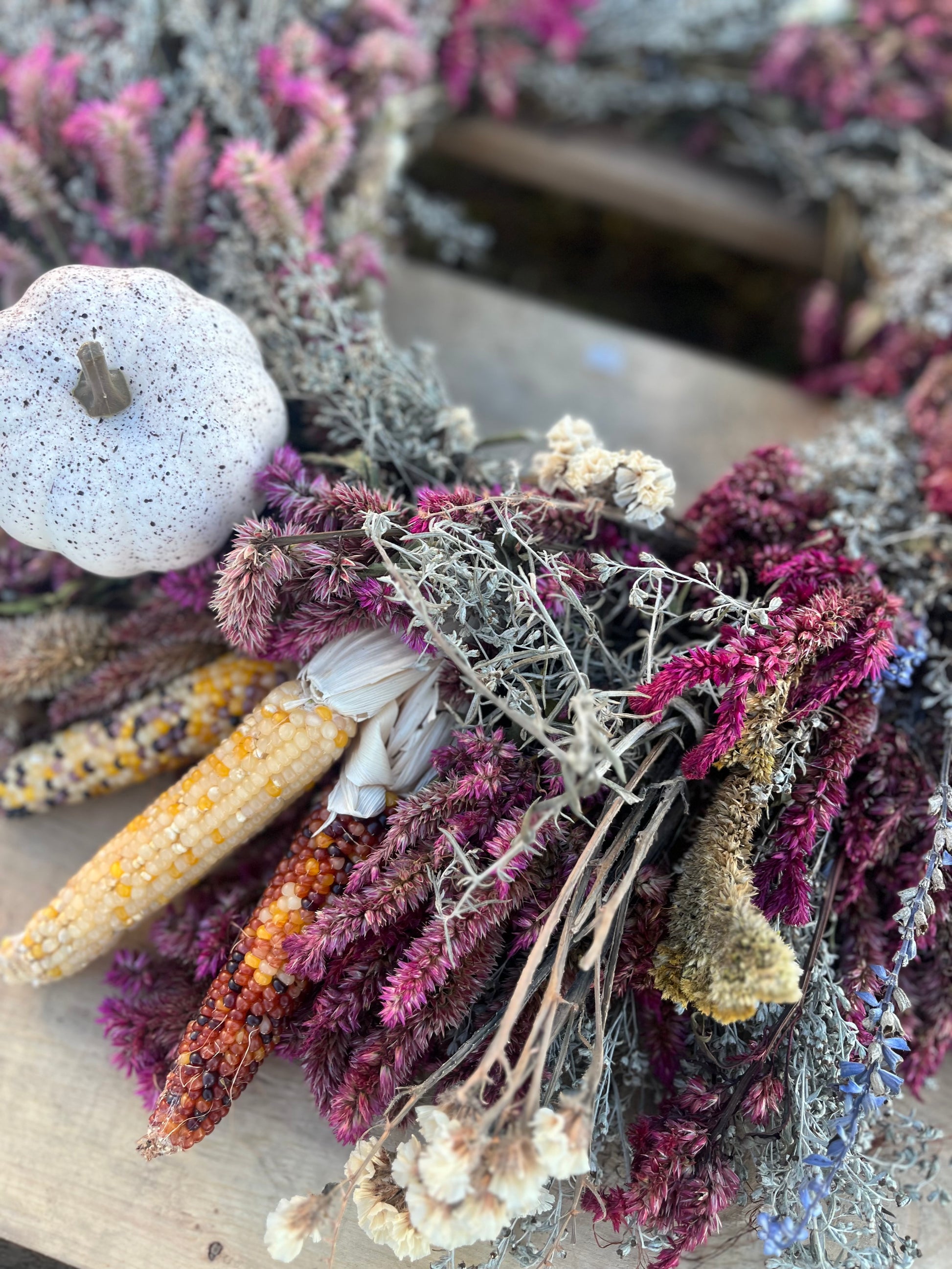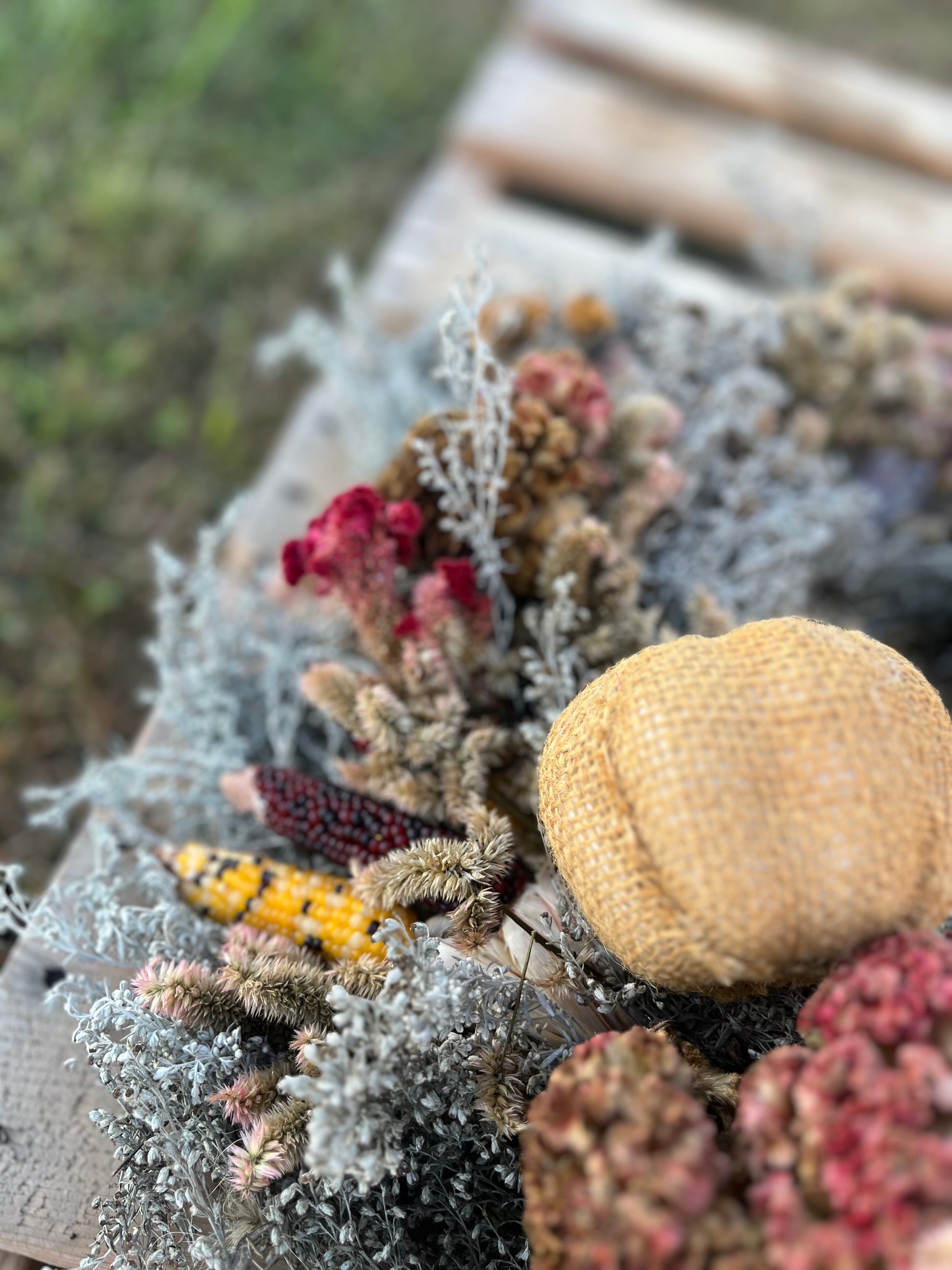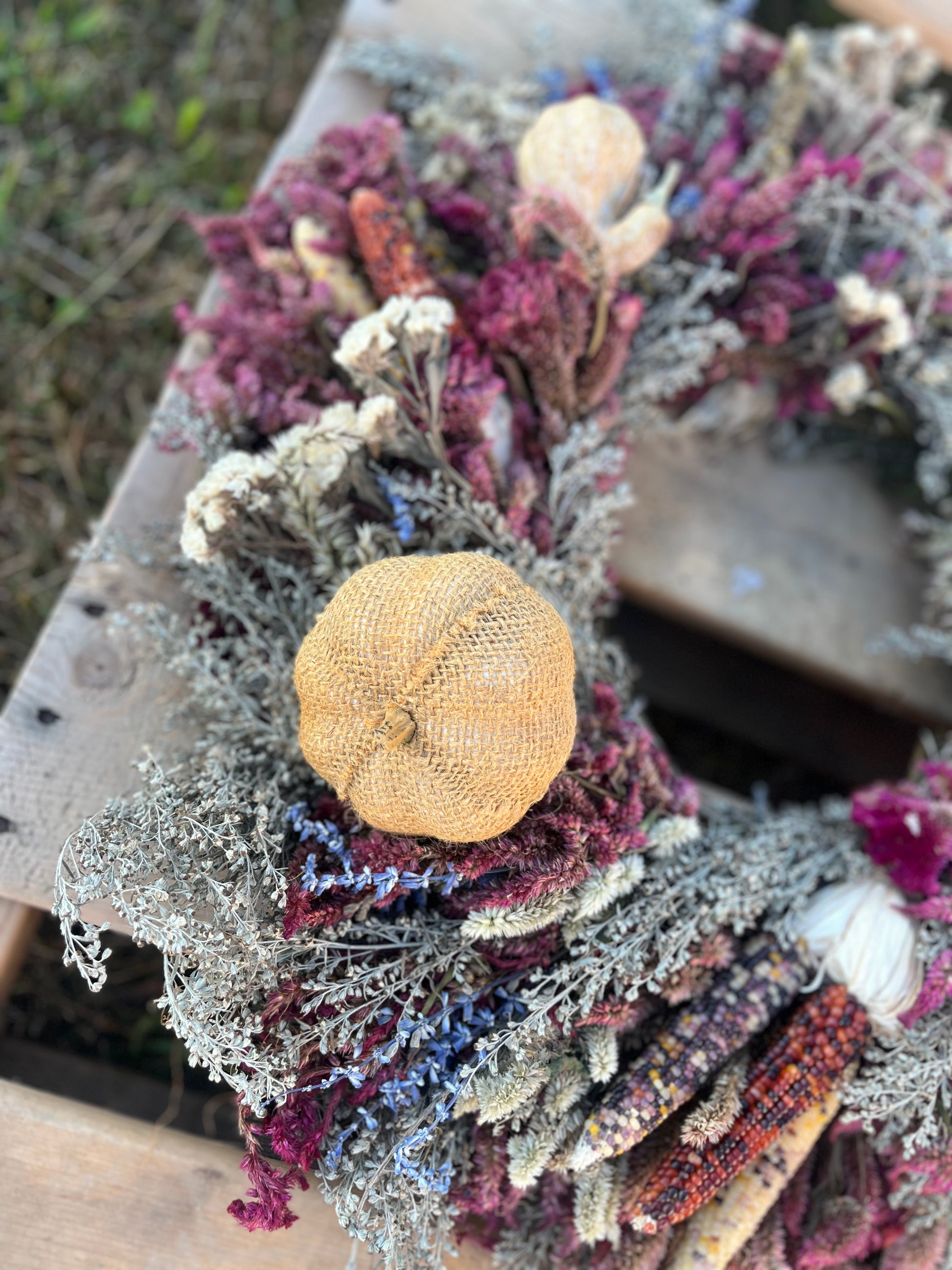 These wreaths are full of rich autumn texture and gentle whimsy, carefully assembled by hand using materials grown or gathered right here in Kentucky. From vibrant purples and soft creams to pops of rustic orange and soft greens, no two are ever exactly the same—but all are equally beautiful.
